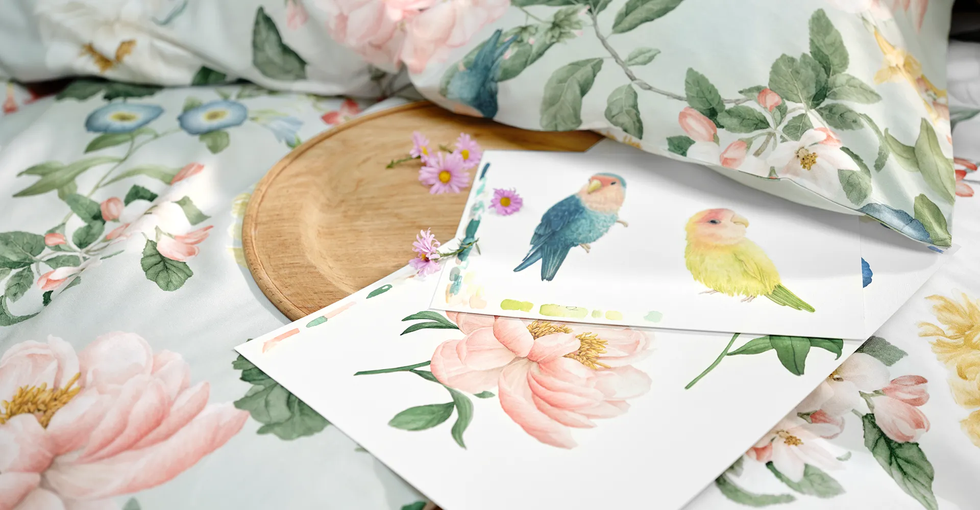 Eine Bettwäsche bei der Nostalgie auf die prächtigsten floralen Frühlingsboten trifft - bei ARTEMIS präsentiert sich ein Blütenmeer aus Pfingstrosen, Leimkraut, Geranien, Tulpen, Apfelblüten, Jasmin, Trompetenblumen und Prunkwinden samt Blattwerk und kleinen exotischen Vögelchen, die sich dazwischen versteckt halten.
