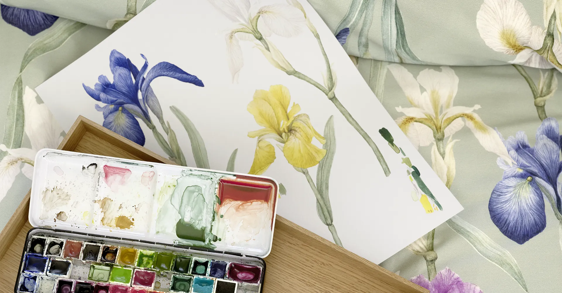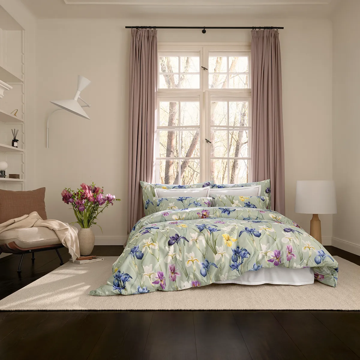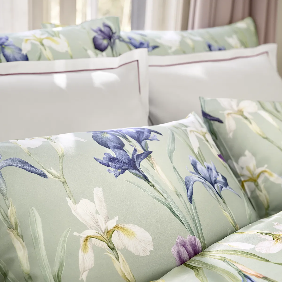 Das Design CHARLOTTE lädt Sie dazu ein, in Ihren eigenen Traumwelten durch eine fast unendliche Wiese voll blühender Schwertlilien zu schreiten. Mit Bewunderung und Hingabe neigen sich die Blütenköpfe auf der Satin-Bettwäsche zu- und voneinander, während sich das Blattwerk im Hintergrund auf den salbeigrünen Fond bettet. Die dunklen und teils kräftig gefärbten Blüten aus Aquarellfarben in samtigem Nachtblau bis Violett, goldenem Gelb und Elfenbein spielen sich in den Vordergrund und genießen all Ihre Aufmerksamkeit.