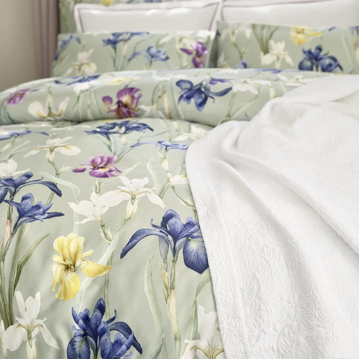 Das Design CHARLOTTE lädt Sie dazu ein, in Ihren eigenen Traumwelten durch eine fast unendliche Wiese voll blühender Schwertlilien zu schreiten. Mit Bewunderung und Hingabe neigen sich die Blütenköpfe auf der Satin-Bettwäsche zu- und voneinander, während sich das Blattwerk im Hintergrund auf den salbeigrünen Fond bettet. Die dunklen und teils kräftig gefärbten Blüten aus Aquarellfarben in samtigem Nachtblau bis Violett, goldenem Gelb und Elfenbein spielen sich in den Vordergrund und genießen all Ihre Aufmerksamkeit.