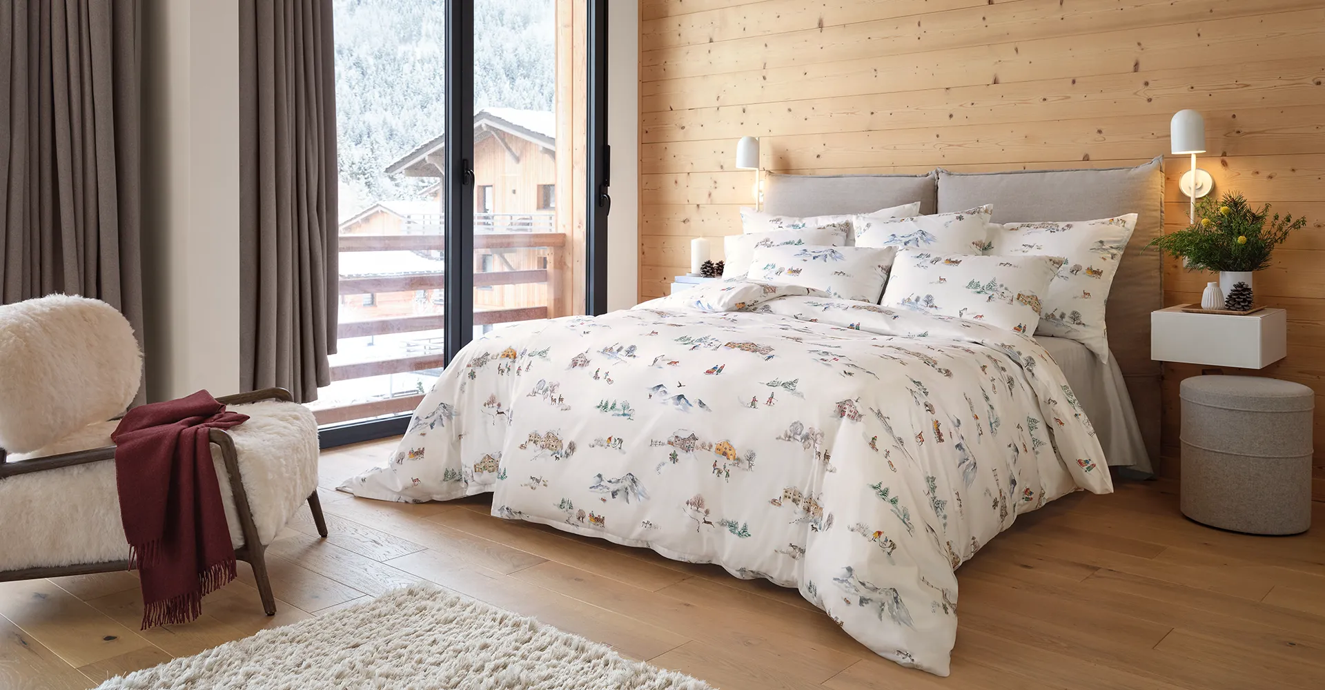 Die illustrative Bettwäsche MONTAGNA erzählt eine kleine Wintergeschichte in einer verschneiten Landschaft; kleine Häuschen mit Sgraffito Fassaden umgeben von der Schweizer Bergwelt, ein Adler, der seine Runden um die Gipfel dreht, schneebedeckte Dächer mit Eiszapfen, ein Pferdeschlitten entlang des Flusslaufes, Rehe und Füchse streifen durch die Winterwelt. Was gibt es in dieser detailverliebten Bettwäsche noch alles zu entdecken? Bestimmt entdecken Sie jeden Abend eine neue kleine Geschichte.