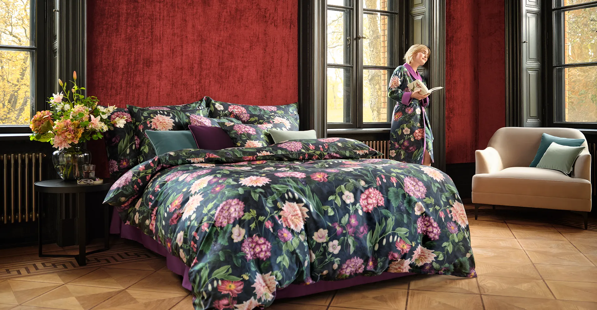 Noch kurz die Träume der Nacht festhalten und gleichzeitig dem neuen Tag entgegenschreiten – mit dem OPHELIA Morgenmantel werden die ersten Morgenstunden zu einem ganz eigenen geheimnisvollen, mystischen Auftritt. Ergänzt wird die betörend-dramatische Blütenpracht um ein Satin-Innenfutter in viola.