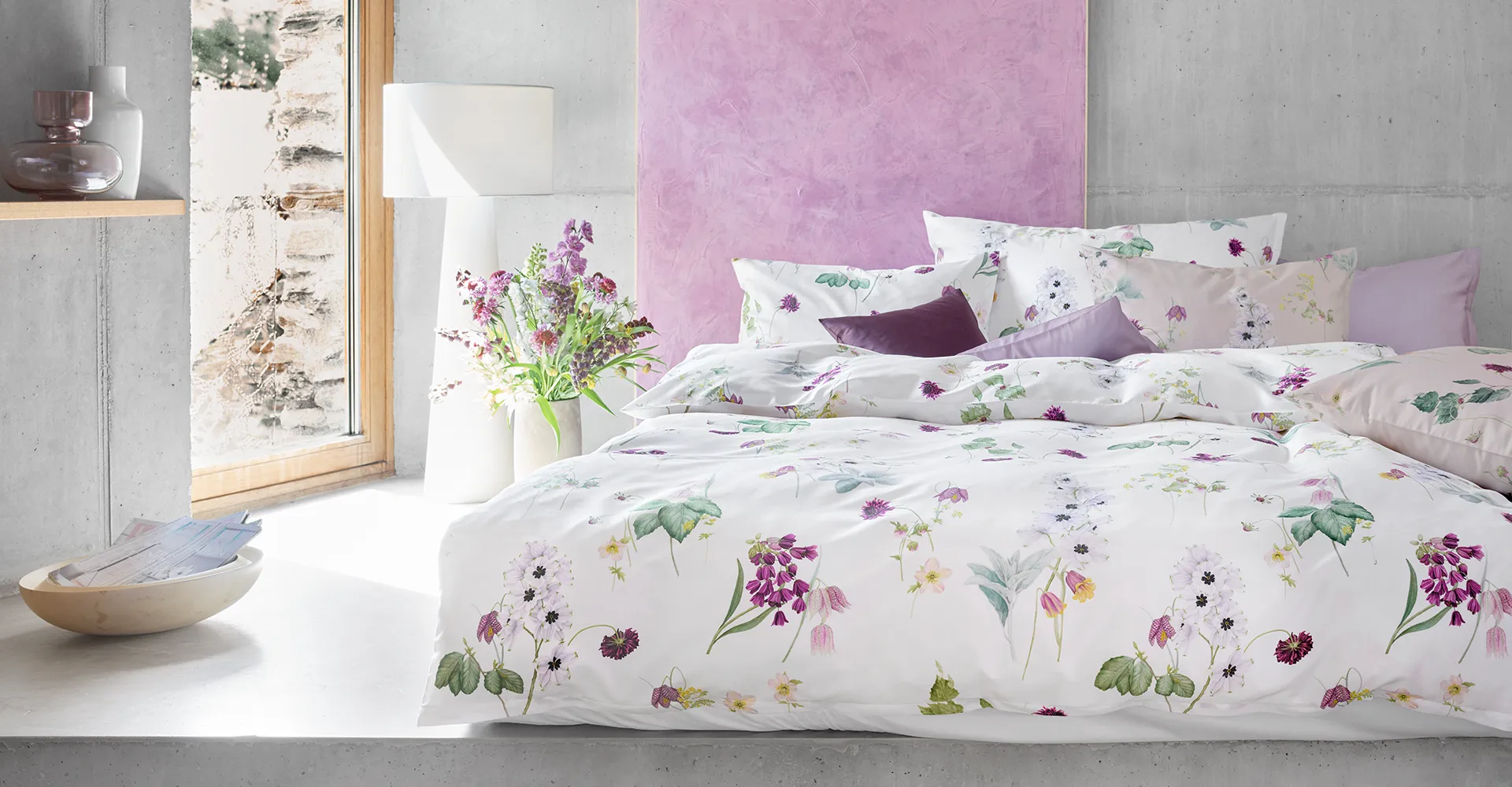 Das Bettwäsche-Design FREYA präsentiert ein zartes Potpourri aus schillernden Grüntönen zusammen mit fliederfarbenen und beige-roséfarbenen Blüten. Bunt gemischt aus Frauenmantel, Rittersporn, Christrosen, Glocken- und Schachbrettblumen und gekonnt ergänzt mit Salbei-, Buchen- und Birkenblättern inspiriert FREYA für einen ausladenden Blumenstrauss.