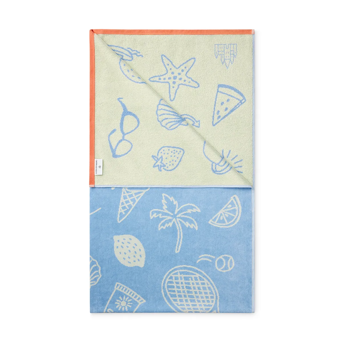 Beim Strandtuch HOLIDAY tänzeln typische Sommermotive und Strand-Assoziationen über den himmelblauen Fond und vermitteln automatisch ein Feriengefühl to go, das wir so schnell nicht mehr vergessen.