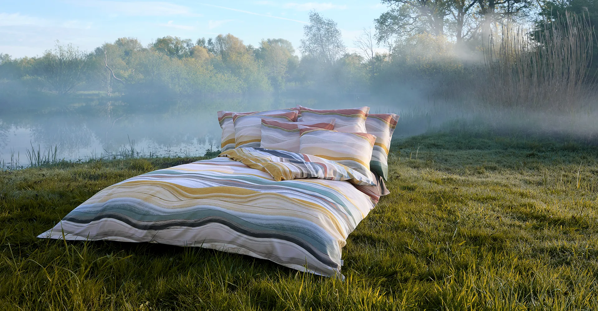 Die Bettwäsche LINUS zeigt sich als ruhige Landschaft in der morgendlichen Dämmerung, die uns noch kurz zwischen Traum und Aufwachen festhält. Wie in einer sanften Wellenbewegung ziehen die goldenen Nebelschwaden über die Herbstfelder, verschwimmen die unterschiedlichen Farbnuancen doch im Licht schon miteinander. Das organisch-grafische Design gezeichnet mit Acrylfarben, erinnert an mystische Tagträume und verleitet zum Innehalten.