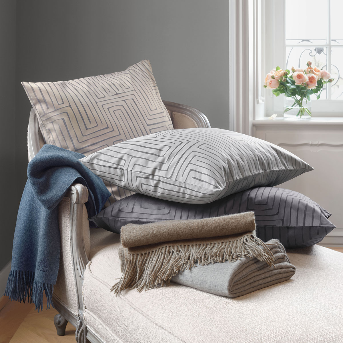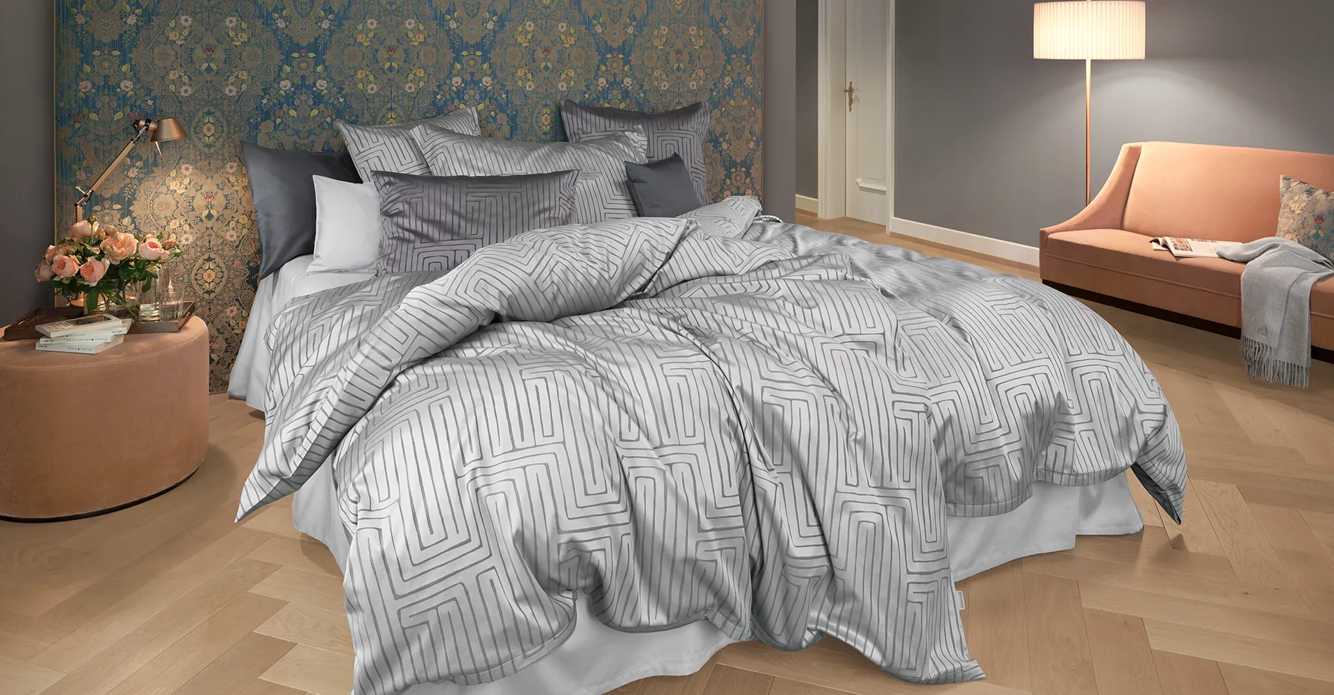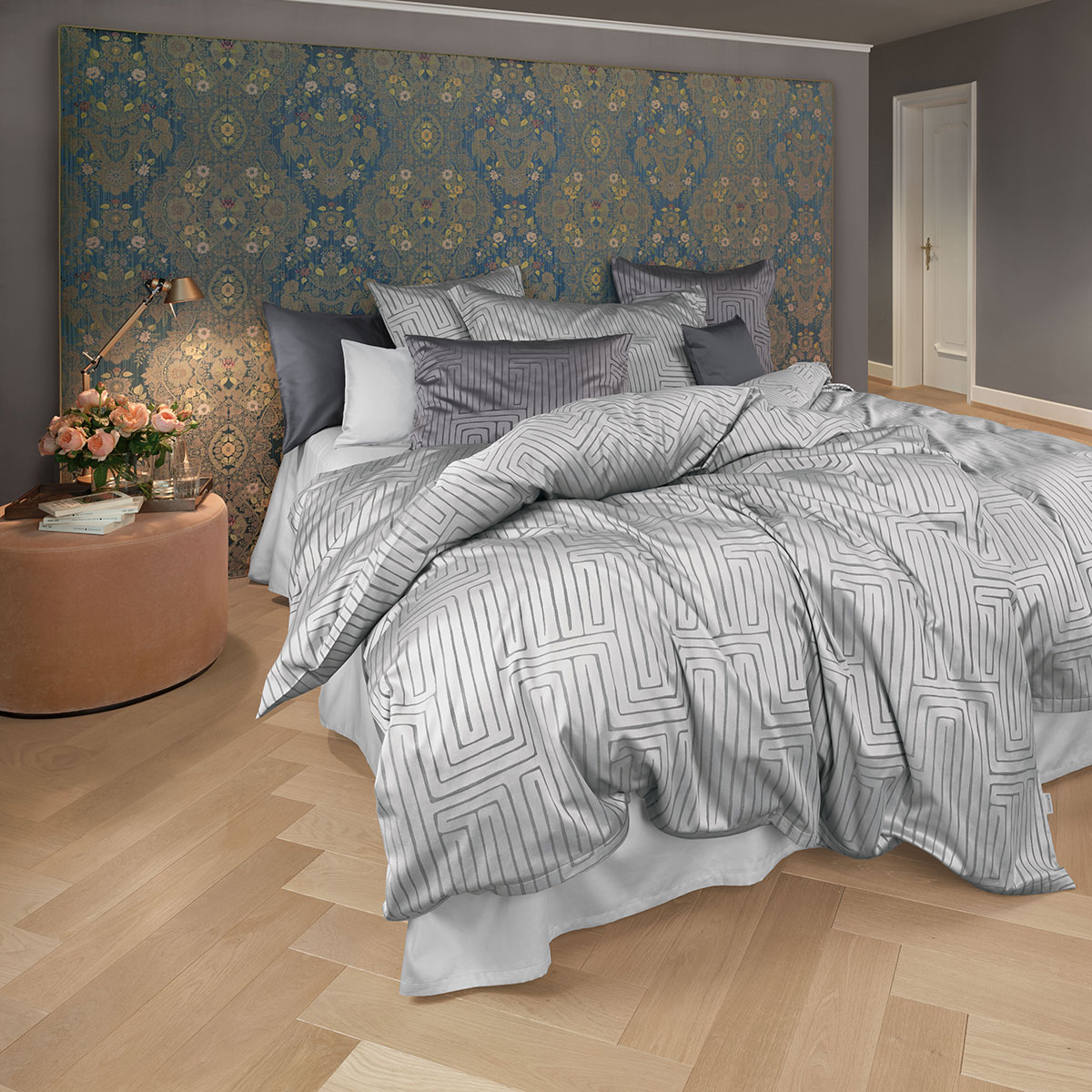Ein grafisch-geometrisches, labyrinthartiges Muster kombiniert mit organischen Linien und changierenden Farbschattierungen in Argent, Beige oder Ombre: das Jacquard-Bettwäsche-Design SILAS erschafft ein erhabenes Farbspiel mit edlem Matt-Glanz-Effekt, wodurch die eingewobenen Muster optimal zur Geltung kommen.