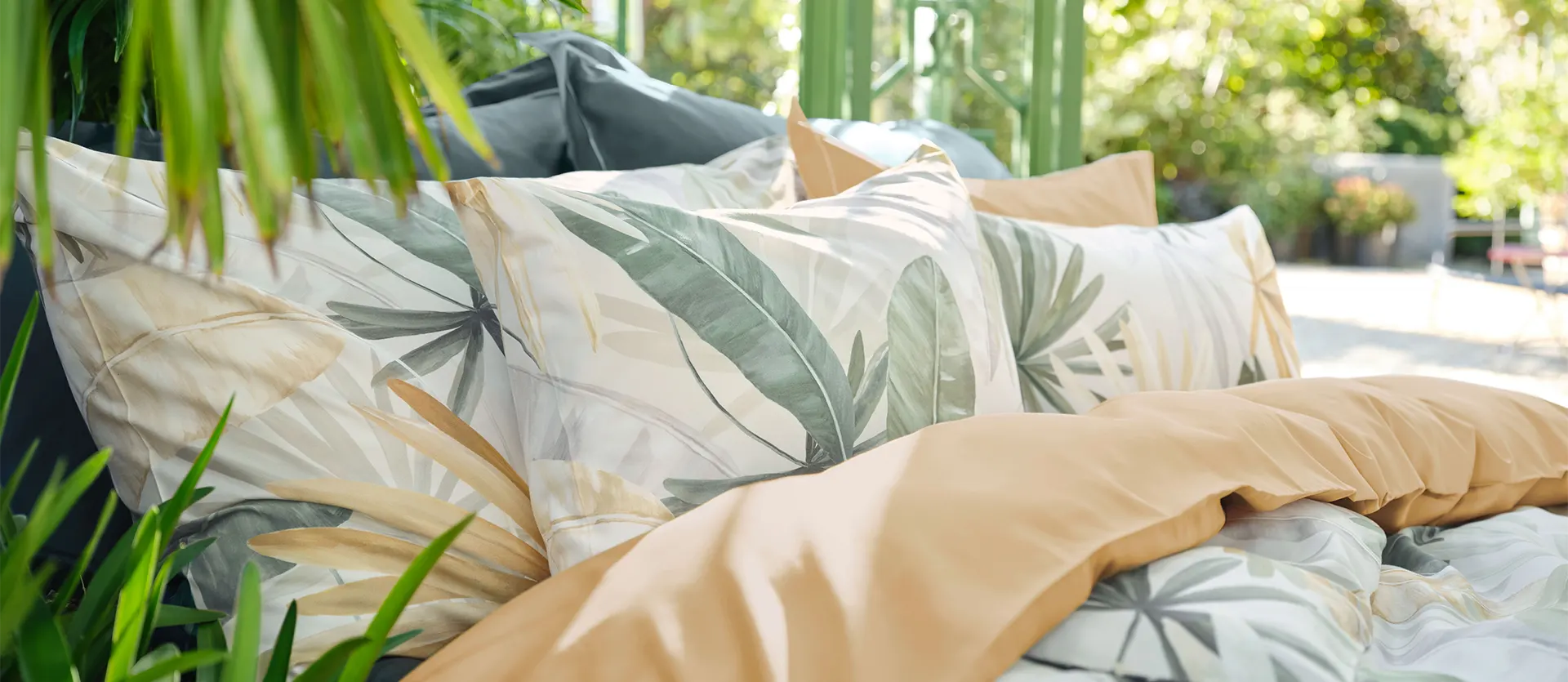 PALMA bed linen is like an idyllic stroll through botanical gardens, where we forget the hustle and bustle of the big city and dream of a place where the sun's rays peek out from between large palm leaves in a wide variety of shapes and species. The interplay of colors and shades even triggers a slight tingle of wanderlust.