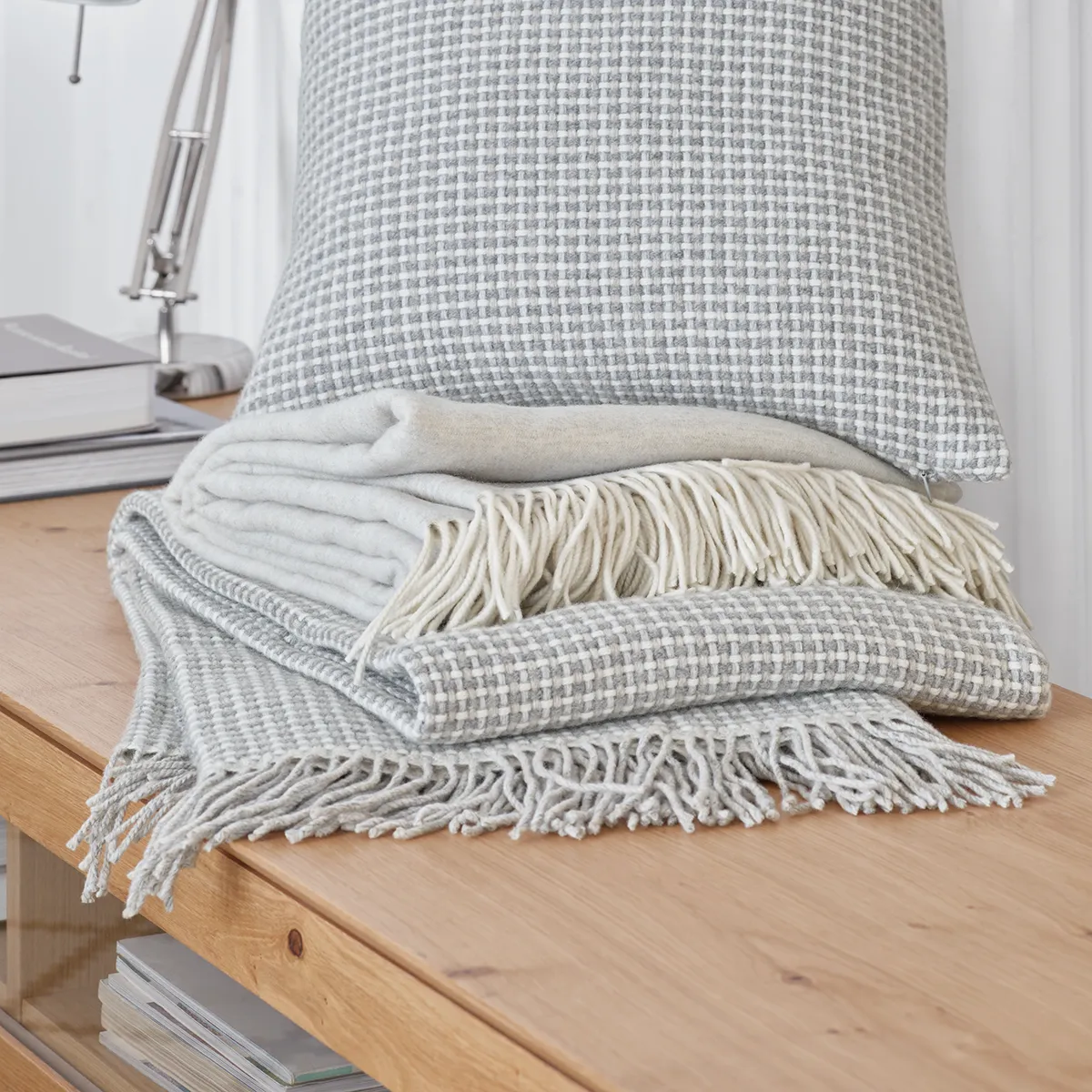 Schlossberg’s FELIX plaid is made of 96% wool and 4% cashmere and features a modern urban look with its ultra-fine, tricolor woven check pattern complemented by color-coordinated fringes in beige and wool white.