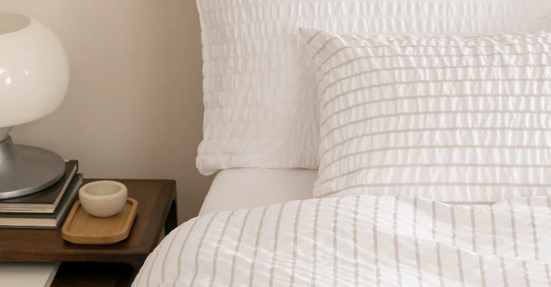 With LENNY, we dream ourselves away to our own summer holiday, where we walk along white sandy beaches, gaze at the waves stretching into the distance and wake up to the sound of the sea. During warm summer nights, this seersucker bed linen provides a light and airy sleeping experience, allowing us to sleep soundly without a care in the world. The fine, single-colour stripes on a white background come in four timeless colours: bright white, modern beige, refreshing lemon yellow and maritime blue offer the right splash of colour for every style.
