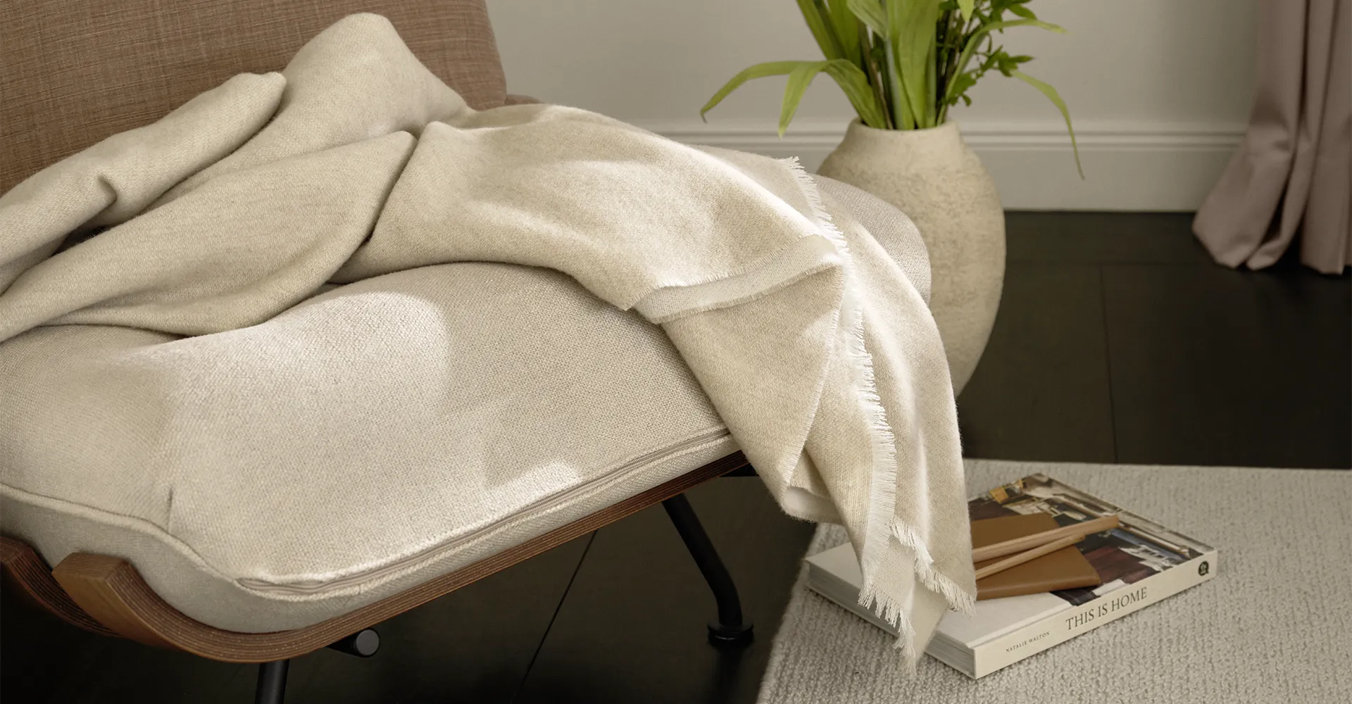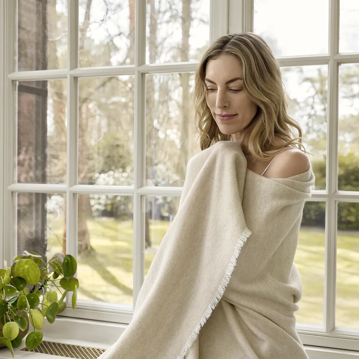 Whether you are watching the whims of nature from the window or holding a warming cup of tea in your hands, as a loving embrace made of 90% wool and 10% cashmere, the DINA plaid is sure to become your favorite companion in the cooler months. In the timelessly combinable colors beige and green, DINA goes well with many bed linen designs and thus provides for very conscious moments of wellbeing.
