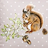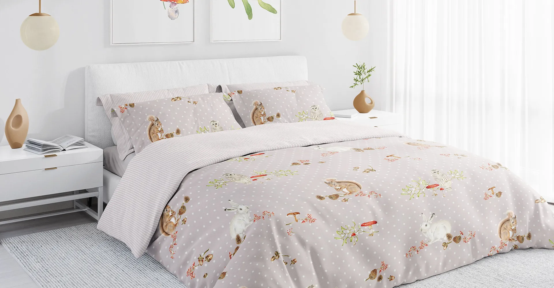 Die illustrative Wendebettwäsche FAVOLA-DUO ist eine Kombination aus feinen Streifen und kleinen Waldbewohnern, die ihre herbstlichen Fundstücke zwischen den ersten Schneeflocken verstecken. Das Eichhörnchen sammelt fleissig Tannenzapfen, der Hase sucht sich einen warmen Rückzugsort und die Eule beobachtet den Waldboden still und leise von ihrem Mistelzweig aus. Nun aber schnell, bevor die dicken Schneeflocken sich wie ein Wintermantel über die Landschaft legen.