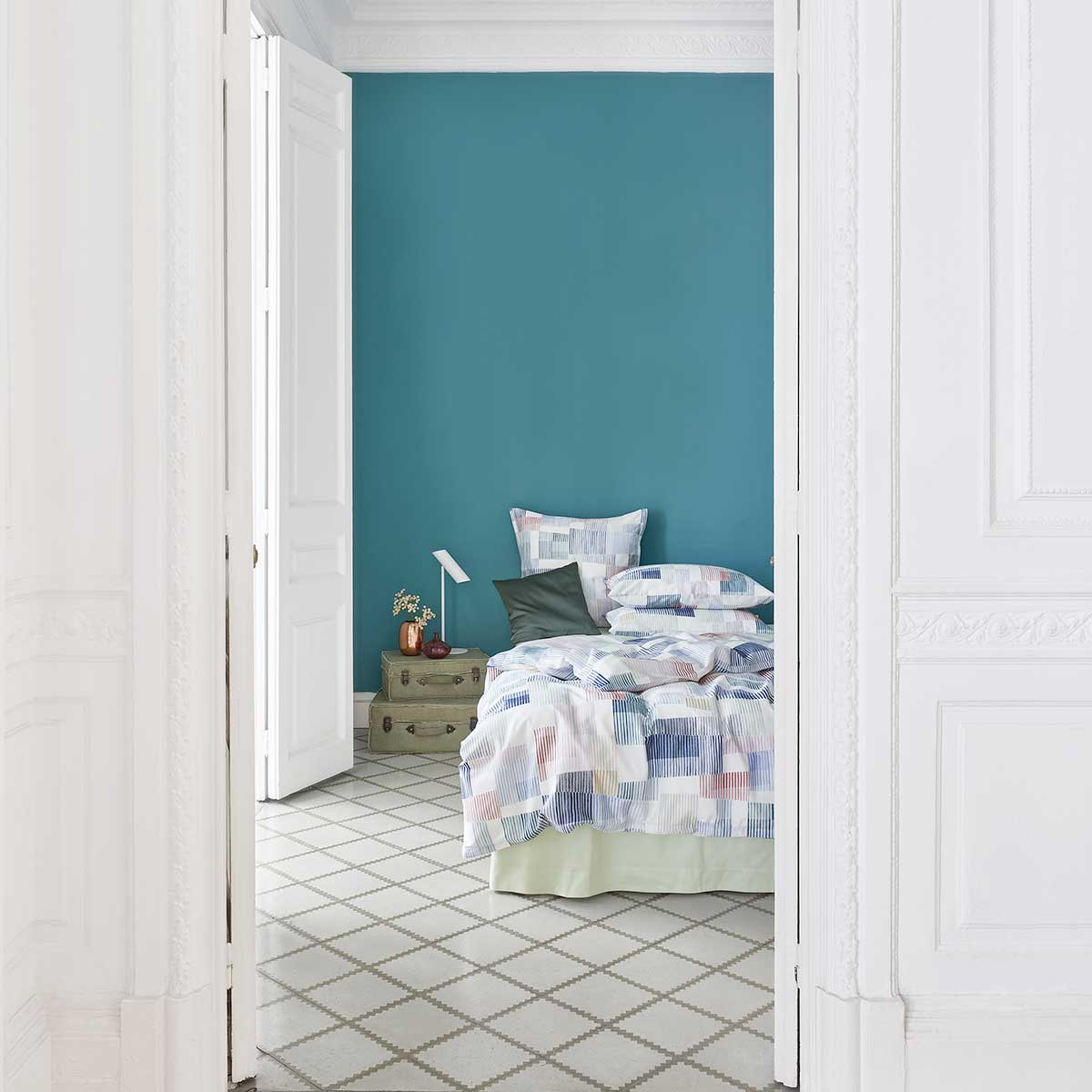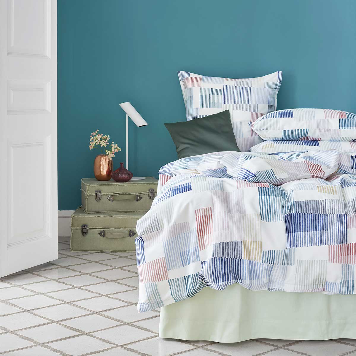Das grafische Design TILL ist inspiriert von architektonischer Kunst. Geometrische Flächen spielen mit Transparenz und verbinden sich im Rhythmus filigraner Streifen und überlagerten Strichverläufen zu unterschiedlichen Rechteckformen. Kräftige Farben aus Marineblau und Petrolgrün ergänzen die zarten Töne aus Himmelblau und Knospengrün. Helles Burgunder und blasses Gold runden die lebendige Komposition der Bettwäsche ab.
